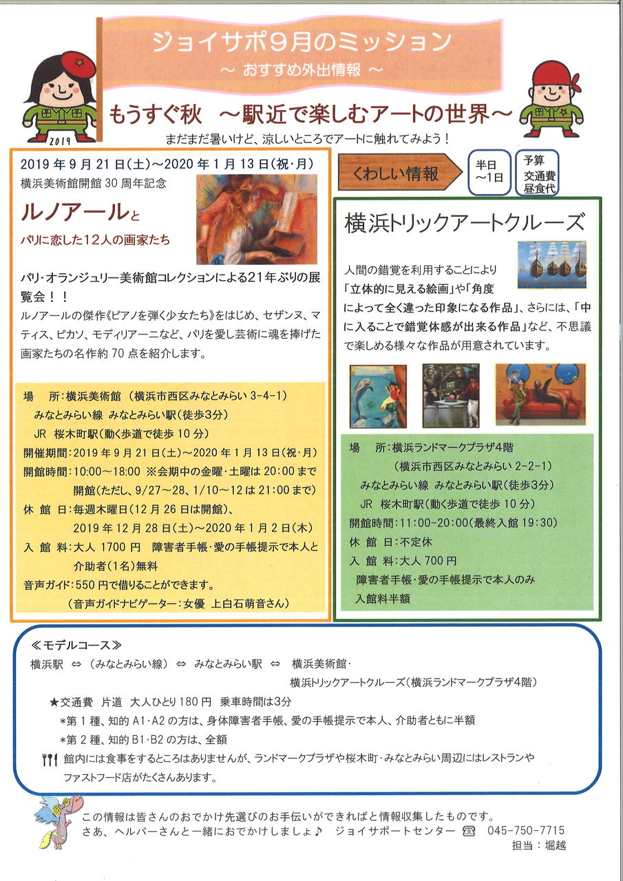 ジョイサポートセンターは、横浜の磯子で障害福祉を行っている事業所です。主な事業は『ガイドヘルパー』。このblogでは、日々のできごとや外出先の情報提供の他、ガイドヘルパーの養成研修のお知らせなどを載せています。 事業所ホームページはこちら → http://joy-isogo.com/joysupport.html